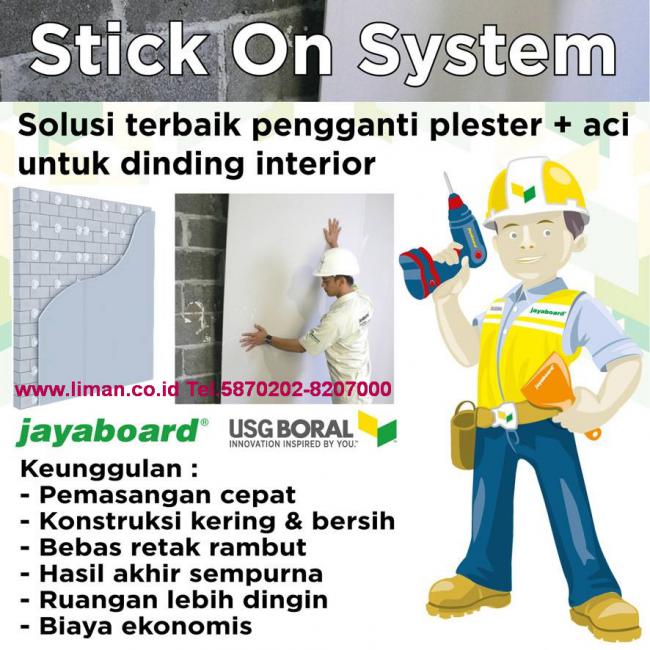Stick On System, sangat cepat dan rapi serta ekonomis... langsung tempelkan saja jayaboard anda ke dinding, tidak perlu plester dan aci sehingga pekerjaan pemasangan dinding sangat cepat. Cocok juga digunakan pada aplikasi rumah-rumah tua yang dindingnya lembab dan tidak bisa diperbaiki dengan cara konvensional.