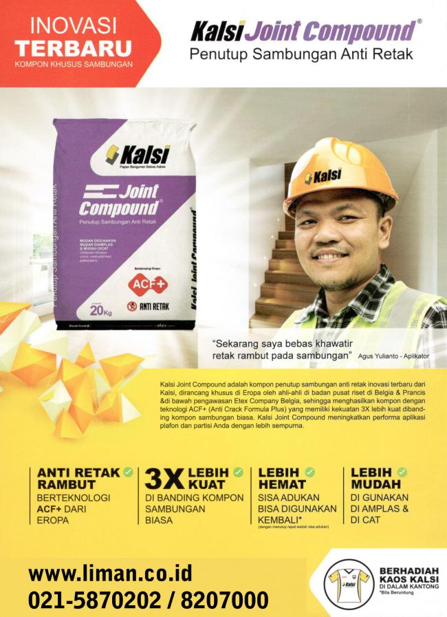 KALSI (facade floor interior ceiling wall) Inovasi terkini dari Kalsi untuk mengatasi retak-retak pada aplikasi penutup sambungan antar Papan Semen. Kuat dan Lentur dengan teknologi dari Eropa
