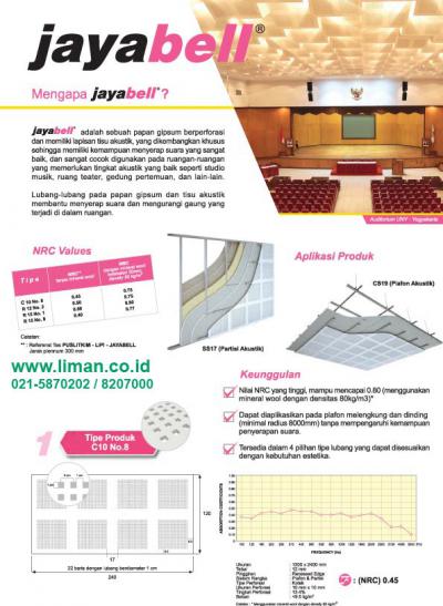 Jayabell adalah papan gipsum akustik yang berlubang-lubang dan memiliki lapisan tisu akusitk sehingga memiliki daya serap suara yang sangat baik. Tersedia dalam empat pola desain yang berbeda, dapat disesuaikan dengan kebutuhan dan estetika. Gipsum Akustik , akustik gipsum ya jayabell